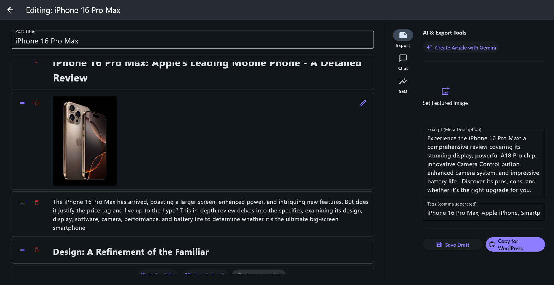 Directly publish your finished articles to WordPress or copy with perfect formatting for any other platform.